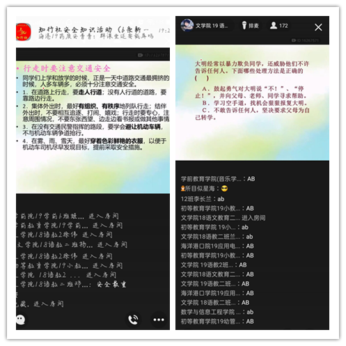 活动依托微信群课堂,首先组织大家有秩序的进行签到接龙,然后运用PPT展示形式,例举一些安全案例给予警示教育,最后的提问环节和个人分享环节,大家参与踊跃,气氛热烈。