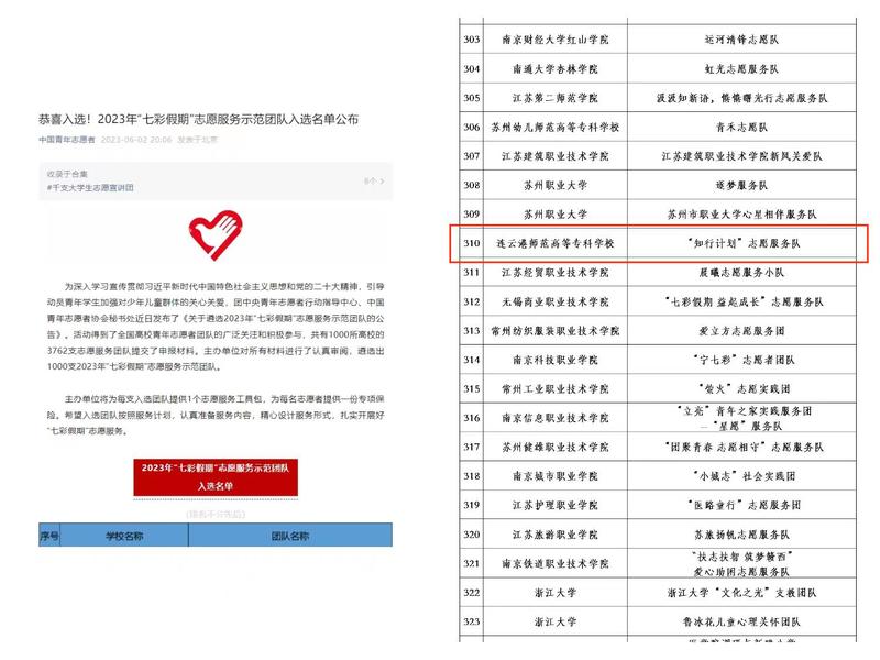 近日,团中央青年志愿者行动指导中心公布了2023年“七彩假期”志愿服务示范团队和2023年全国老员工“两弹一星”精神志愿宣讲团名单,公司知行社志愿服务队成功入选。