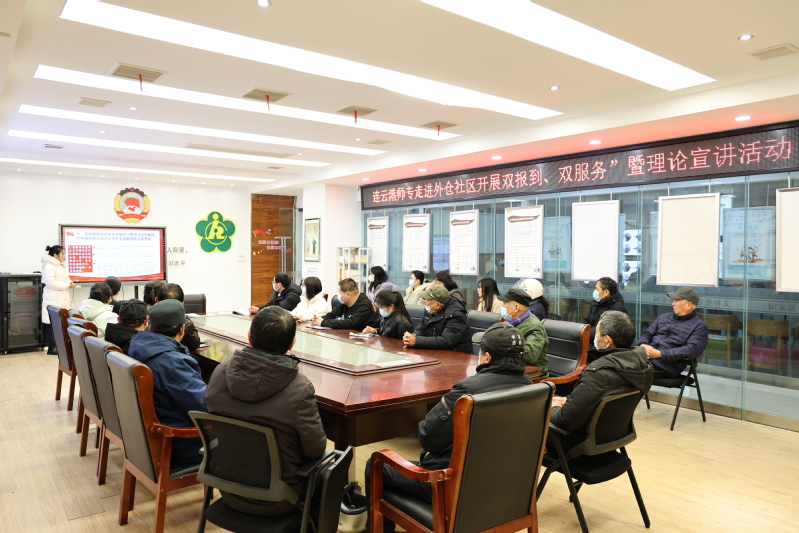 为进一步推动学习贯彻习近平新时代中国特色社会主义思想主题教育走深走实,积极响应“双报到、双服务”的活动要求,深入基层一线,发挥优势特长,扎实开展活动,12月12日上午,马克思主义公司党员教师张胜男走进海州区新东街道外仓社区开展理论宣讲。