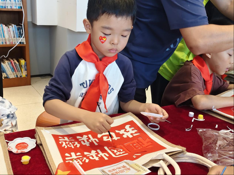 在实践环节中,孩子们在志愿者耐心指导下开展了富有创意的麻布包拓印手工制作活动。活动现场准备了多种印有“欢度国庆”、“月满中秋”等字样的拓印模板,以及红、黄等象征节日氛围的环保颜料。孩子们认真挑选自己喜欢的模板,仔细固定在空白麻布包上,然后小心翼翼地蘸取颜料进行拓印。在志愿者的协助下,一个个独具特色的手工作品陆续完成:有的印着鲜艳的五星红旗图案,有的展现玉兔捣药的生动场景,还有的将“安全第一”的字样与节日元素巧妙结合。孩子们兴奋地互相展示自己的创作成果,现场洋溢着欢乐的气氛。